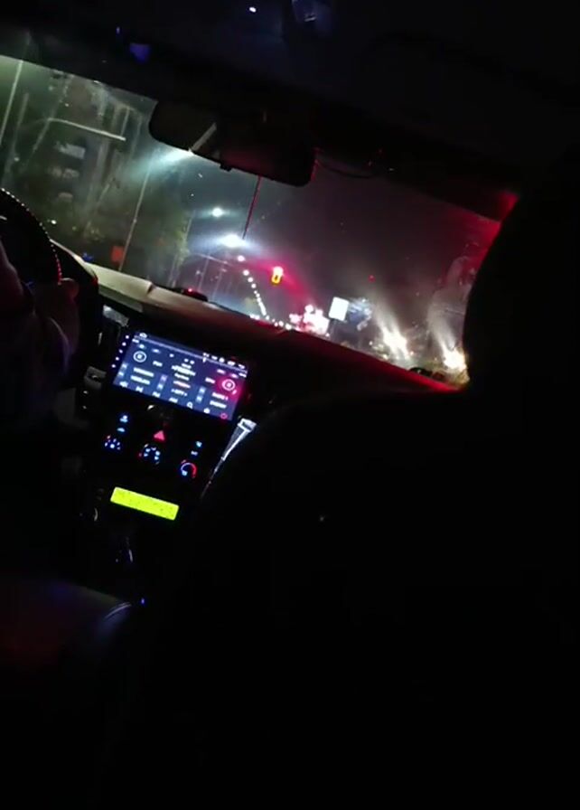 view from inside a car at night. The driver's hands are visible on the steering wheel. The car is stopped at a red light on a street with other cars. The dashboard is illuminated and a colorful pattern is displayed on the car's infotainment screen. There is a passenger in the backseat. Music is playing.