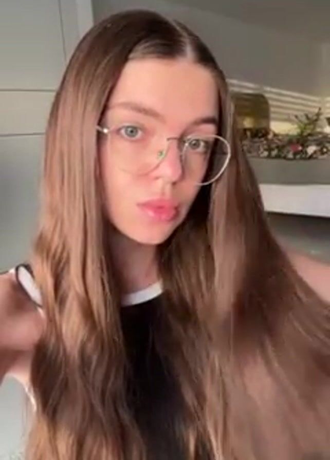 A young woman with light brown hair and round glasses is facing the camera. She has fair skin and her hair is parted in the middle, falling to her shoulders with a slight wave. She is wearing a black tank top with white trim. She briefly pushes her glasses up her nose. The background includes a white doorframe on the left, a bed with patterned bedding partially visible behind her, and sunlight streaming through a window with blinds.