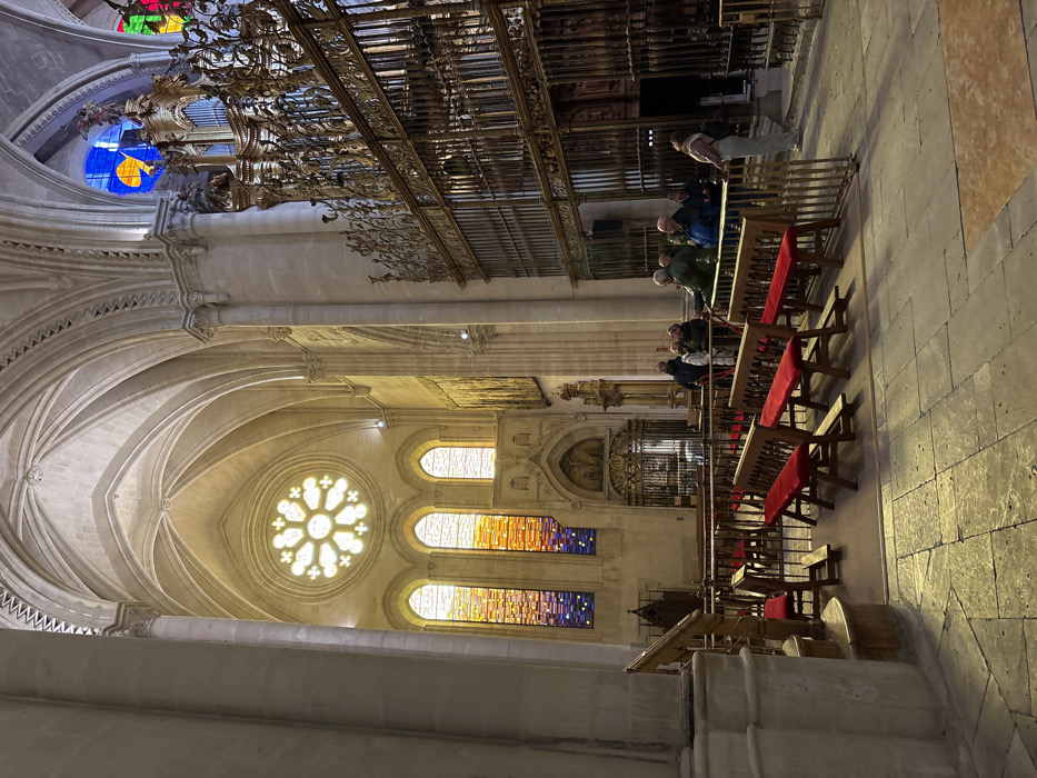This image depicts the interior of the Cuenca Cathedral (Catedral de Santa María y San Julián de Cuenca) in Cuenca, Spain. The scene showcases a section of the cathedral characterized by high vaulted Gothic ceilings supported by robust stone columns. A prominent feature is a large, circular rose window emitting bright light, located high on a distant wall. Directly below it are three tall, arched windows filled with contemporary stained glass exhibiting a gradient of colors from blue and purple on the left to orange and yellow hues on the right. To the far right, a tall, ornate dark gold metal grille, likely part of a rood screen or choir gate, features intricate scrollwork and vertical bars. Behind this grille, sections of a pipe organ are visible, along with additional stained glass windows, one notably featuring a yellow fish symbol against a blue background. In the mid-ground, a series of dark wooden benches with bright red velvet cushions are arranged on a slightly elevated platform, separated by a low wooden barrier. The floor consists of large, light-colored stone tiles. A group of approximately seven to eight individuals, dressed in coats and jackets, stands near these benches in the mid-ground. Most are observed looking upwards, appearing to examine the architectural details and windows. The space is illuminated by natural light streaming through the windows and supplementary artificial spotlights within the vaulted ceiling.