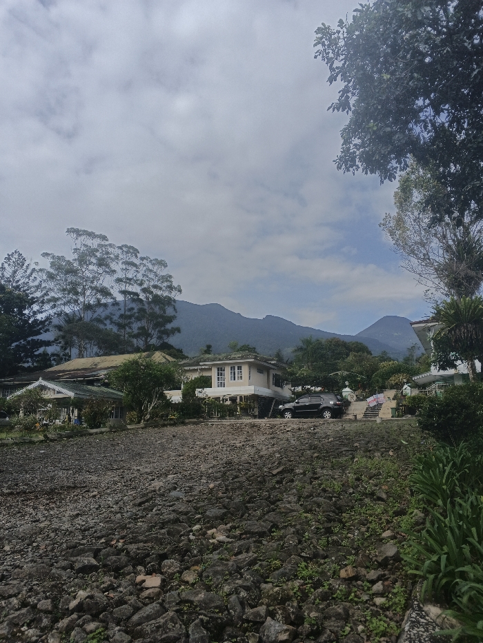 The image displays an outdoor, static scene located in the city of Unknown, Uruguay. The foreground consists of uneven, dark grey rocky terrain intermixed with sparse green vegetation. In the midground, several structures are visible, including a prominent two-story, light-colored house with white-framed windows and a green roof. To its left, a single-story building with a light-colored exterior and a darker roof is partially visible. A dark-colored SUV is parked on an elevated, paved or dirt area in front of the central house, with light-colored stairs leading upwards to the right of the vehicle. The background features a range of large, green, tree-covered mountains beneath an overcast sky with visible patches of blue. Tall, slender trees with light green foliage are present on the left side of the frame, while dense green trees and shrubs are scattered throughout the midground and background. No individuals or active subjects are depicted.