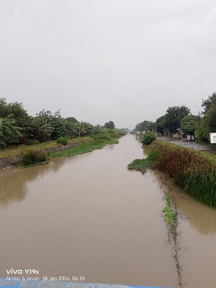A long, straight canal filled with murky, brown water dominates the scene. Lush vegetation lines both banks, including banana trees on the left. A narrow road runs alongside the right bank, with trees and a building visible in the distance. Overcast skies create a flat, dull light. The photo's bottom edge reveals a bridge railing, indicating the viewpoint. The date and time, along with camera information, are imprinted at the bottom.