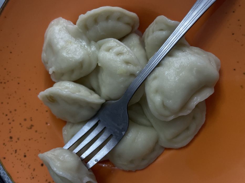 - "The image displays a close-up, overhead view of a quantity of cooked dumplings, consistent with pelmeni or varenyky, served on an orange ceramic plate" by FM-sq6qa2, licensed under CC BY 4.0