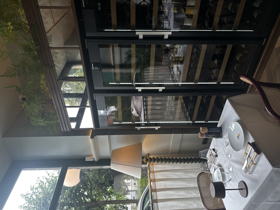 The image depicts an interior view of a restaurant located in Strasbourg, France. The scene is devoid of people. In the foreground, a dining table is set for two, covered with a white tablecloth. On the table, two white plates, a set of cutlery, three wine glasses, and two water glasses are arranged. A small, dark, cylindrical portable lamp sits on the table to the left. Accompanying the table are two chairs featuring wicker backs and dark frames. To the right of the table, three tall, black Liebherr wine refrigerators are visible, each equipped with glass doors displaying multiple shelves of wine bottles. Vertical LED strips illuminate the interior of the refrigerators. Above these units, a wooden structure with several mirrored panels reflects parts of the ceiling and opposite wall. On top of this structure, various ferns and green plants are arranged. A small white security camera is mounted high on the wall amongst the foliage. To the left, a large window spans from floor to ceiling, looking out onto a street scene with numerous green trees and a silver parked car. A light-colored, full-length curtain hangs behind the table, partially obscuring the lower portion of the window view. A tall floor lamp with a white, rectangular fabric shade and a dark, multi-faceted base stands between the table and the window. The interior wall is painted a light green hue, and the floor is composed of wooden planks.