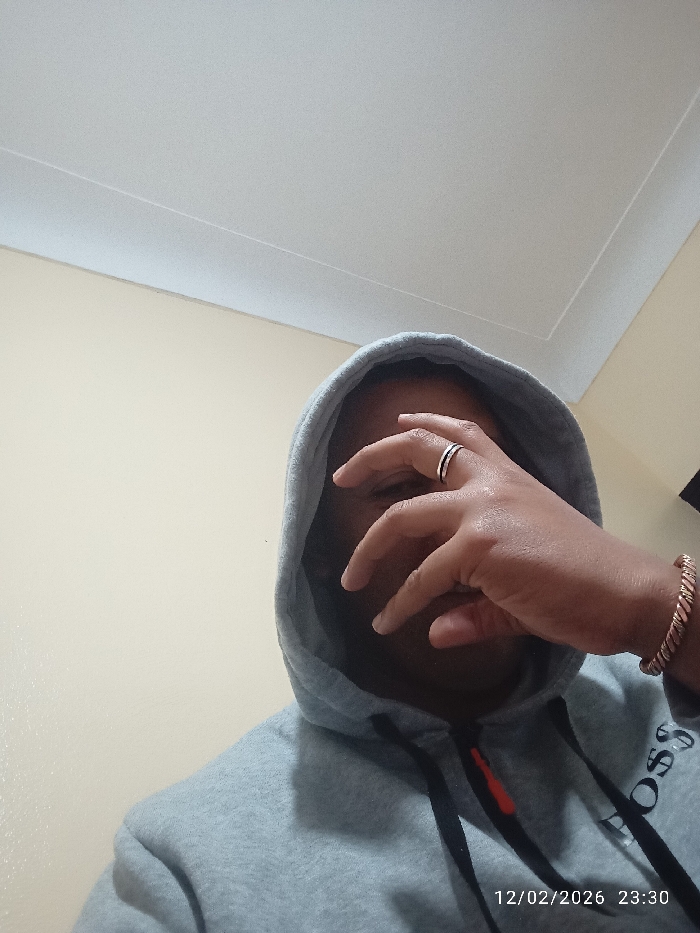 A person wearing a gray hooded sweatshirt partially covers their face with their hand. A ring is visible on one of their fingers. The sweatshirt has black drawstrings with an orange detail and the word "BOSS" in white lettering. A copper-colored bracelet adorns their wrist. The background consists of a light beige wall and a white ceiling. The image includes a timestamp in the lower right corner, indicating "12/02/2026 23:30".