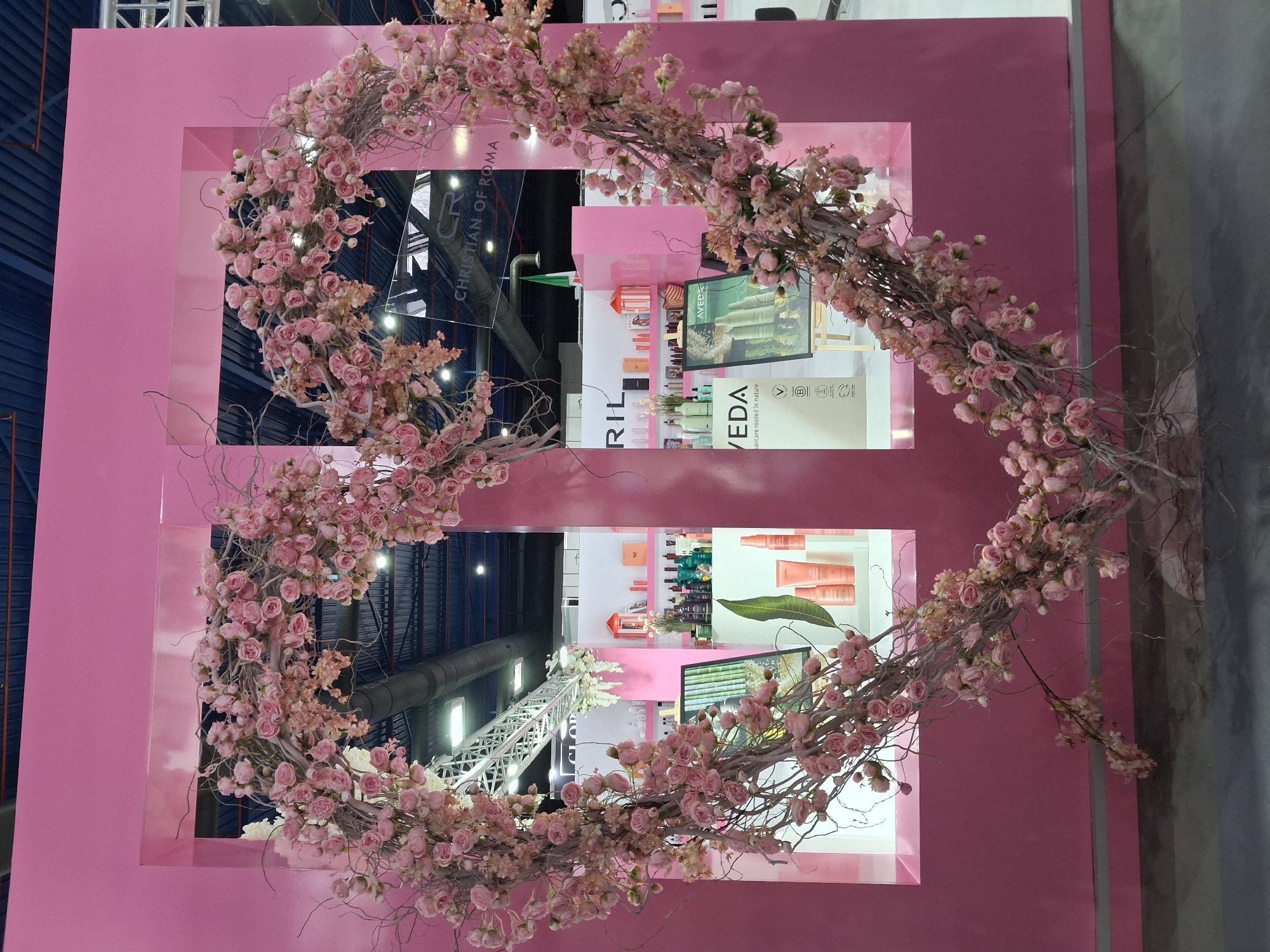 An indoor scene, likely within an exhibition hall in Plovdiv, Bulgaria, prominently features a large, heart-shaped floral display. This heart is constructed from a dense arrangement of intertwined bare branches heavily adorned with numerous clusters of artificial light pink roses. It is centrally positioned against a matte pink partition wall, framing two rectangular openings that provide a view into adjacent exhibition spaces. Through the left opening, white shelving units display various beauty and cosmetic products, including bottles and tubes, set against a white and pink background, with hints of green foliage. Above, white metal truss structures and a dark industrial ceiling with embedded lighting are visible. The right opening similarly reveals product displays, notably a black easel featuring an "AVEDA" brand poster advertising "haircare rooted in nature." The text "CHRISTIAN OF ROMA" is discernible on a reflective surface above this opening, and a partial green, white, and red stripe, indicative of an Italian flag, is faintly visible in the upper background. The floor throughout the visible area is a dark gray, unadorned industrial surface. No individuals are present in the frame. The scene is illuminated by ambient artificial overhead lighting.