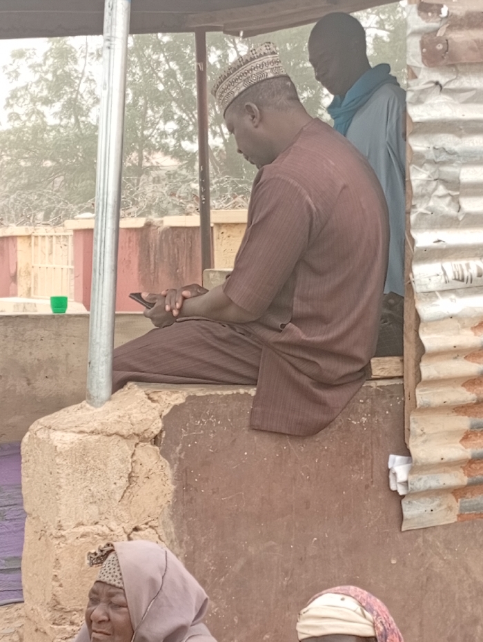 A man in brown attire and a patterned cap sits on a weathered structure, absorbed in his phone. Behind him stands another man with a blue scarf. A corrugated metal sheet forms part of the background. Below, partial views of two women wearing head coverings are visible, suggesting a gathering. A green cup sits on a ledge in the middle ground. The atmosphere suggests an informal outdoor setting.