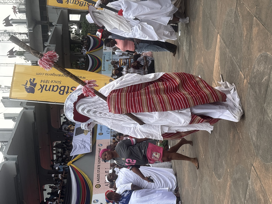 The image depicts an outdoor cultural event in Lagos, Nigeria, likely held at a public square or stadium such as Tafawa Balewa Square, indicated by banners displaying "LAGOS STATE GOVERNMENT" and a concrete spectator stand