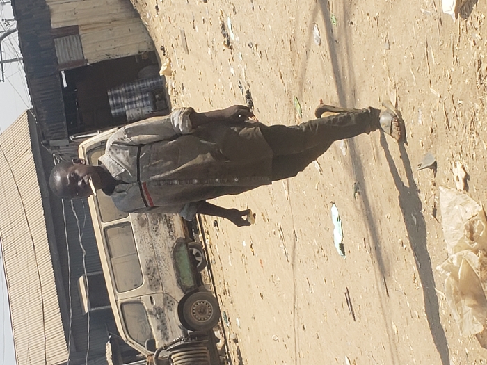 A young male individual walks across an unpaved, debris-strewn dirt path in Kwamba, Nigeria