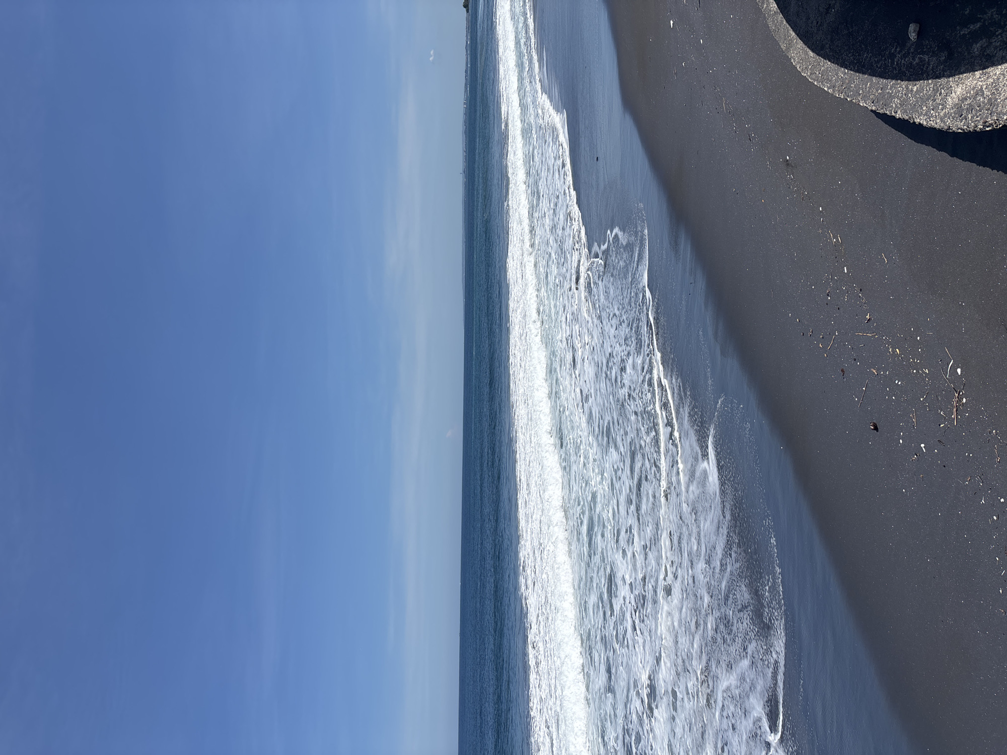 view of a black sand beach in Blahbatuh, Indonesia, with the ocean on the right and a clear blue sky on the left