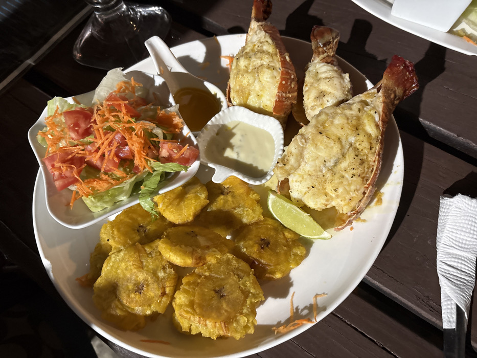 - "This image depicts a prepared meal presented on a large white oval plate, set on a dark brown wooden slatted table, likely in an outdoor dining environment at night in the city of Roatán, Honduras" by FM-1fpML2, licensed under CC BY 4.0