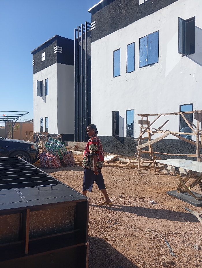 The scene depicts an outdoor area in Bar Gada, Nigeria, characterized by reddish-brown soil. Two multi-story buildings, featuring white facades with black upper sections and decorative black vertical elements, dominate the background under a clear blue sky. The building on the right has several windows, some with blue reflective panes, while one upper window is open. A wooden scaffolding structure stands near its base on the right. In the midground, an individual walks from left to right. This person wears a patterned red, yellow, and black short-sleeved shirt, dark blue shorts, and light-colored sandals. Their shadow is visible on the ground. To the left of the walking individual, several large, multi-colored sacks are piled on the ground near the front quarter of a dark-colored SUV. A metal frame structure is partially visible behind the vehicle. In the immediate foreground, a large, dark-colored rectangular object, possibly a piece of furniture or an outdoor storage unit with multiple compartments and a handle, occupies the lower left corner. To the right of the walking individual, a table with a light-colored top and a gold-colored, X-shaped base is positioned near the scaffolding. The ground is uneven and appears to be a construction site or an unpaved area.
