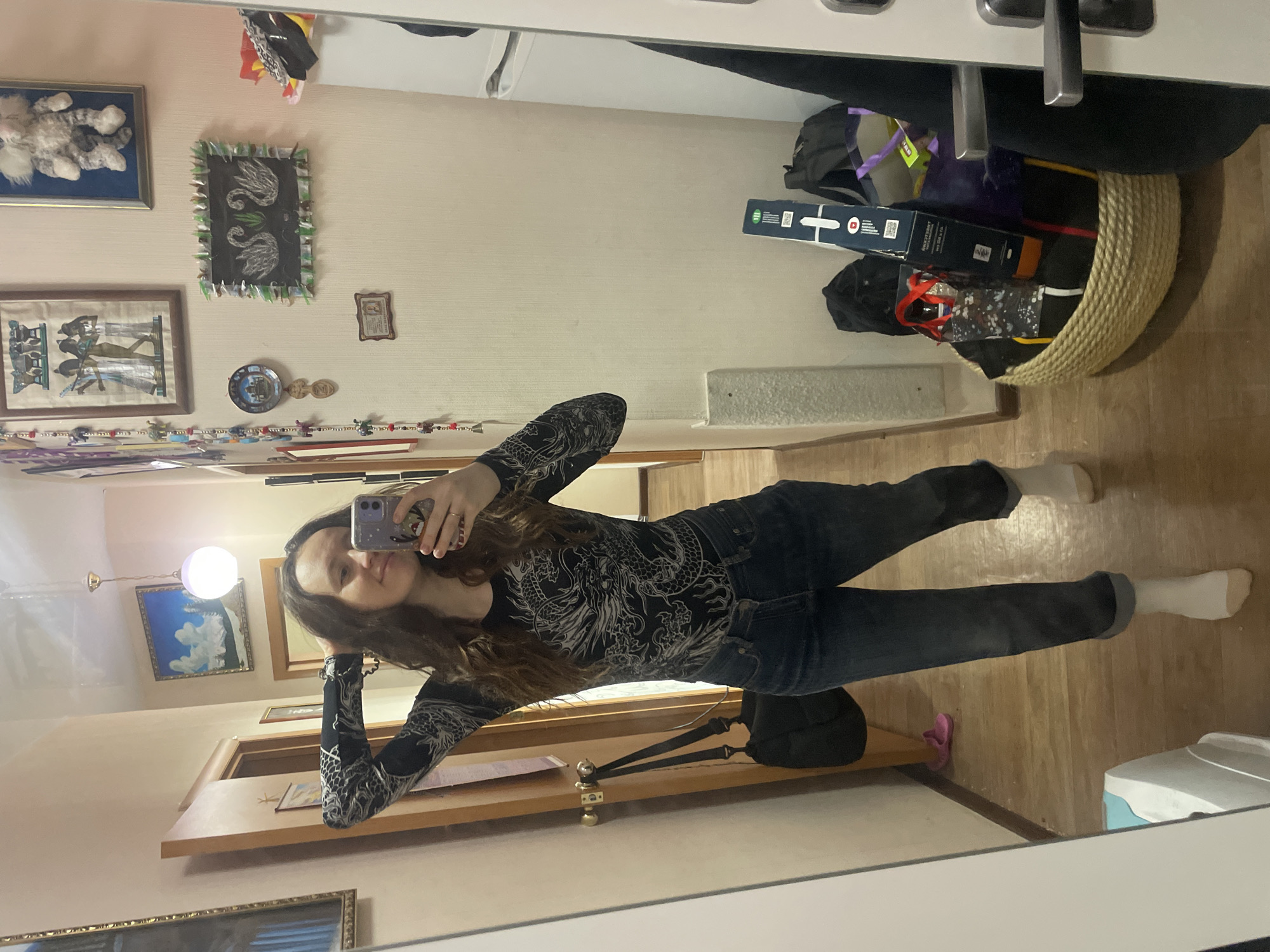 A female is depicted taking a mirror selfie in a hallway located in the city of Podstepki, Russia. She has long, wavy brown hair and is wearing a black long-sleeved shirt with a white dragon-like pattern, dark blue cuffed jeans, and white socks. She holds a light purple smartphone in her right hand to capture the image, while her left hand is raised behind her head. She smiles faintly. The hallway features light wood flooring and cream-colored walls. In the background, a wooden door with a brass-colored doorknob is visible, from which a black shoulder bag hangs. Further down the hallway, a pair of pink slide sandals are on the floor. A spherical ceiling light fixture illuminates the area. Wall decorations include a framed piece of Egyptian-themed art, a framed plush animal toy, a framed picture depicting two white swans, a decorative plate, and a long string of small, multi-colored figures. To the right, a large, woven basket on the floor contains various items, including a black backpack, a purple tote bag, and a rectangular blue and white box. A white appliance and a white door frame are partially visible on the far right of the frame.