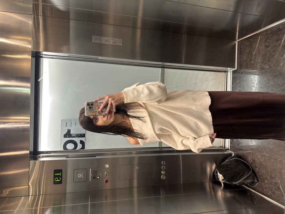 A woman stands in an elevator, taking a selfie with her phone. She wears a cream-colored sweater and a brown skirt. A black purse sits on the elevator floor. The elevator's control panel is visible, showing the floor number as 13. The interior of the elevator is metallic, with a mirror effect that reflects the surroundings.