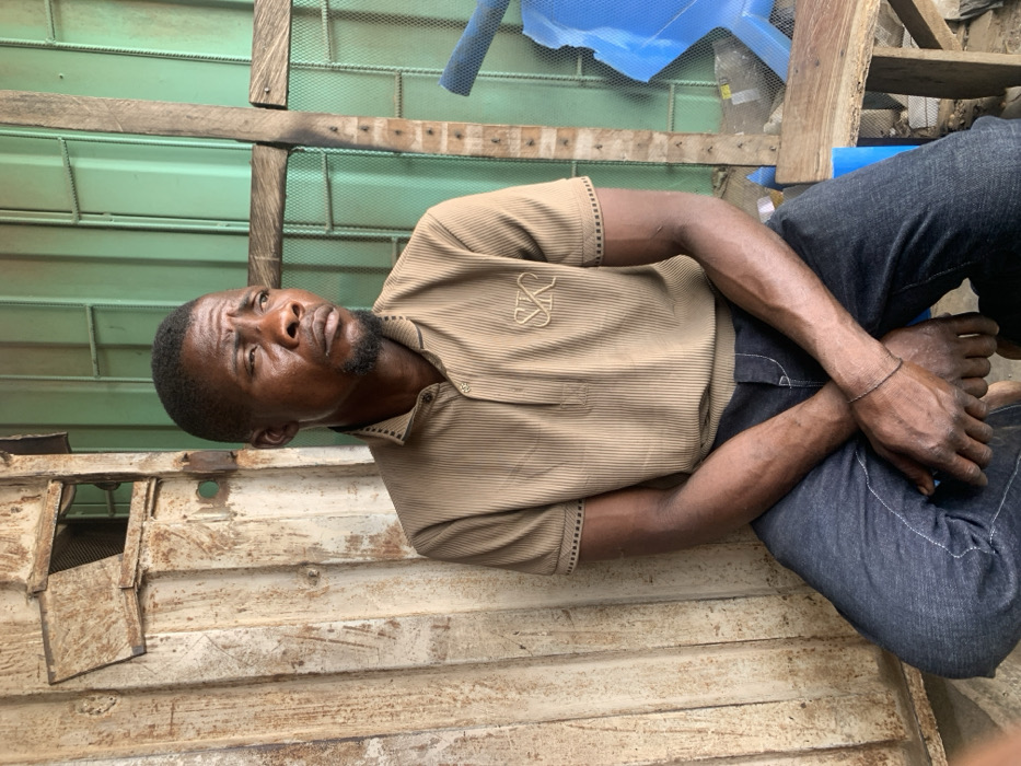 An adult male, approximately 30-40 years old, with short dark hair, a beard, and mustache, is seated in an outdoor or semi-sheltered location in Okene, Nigeria