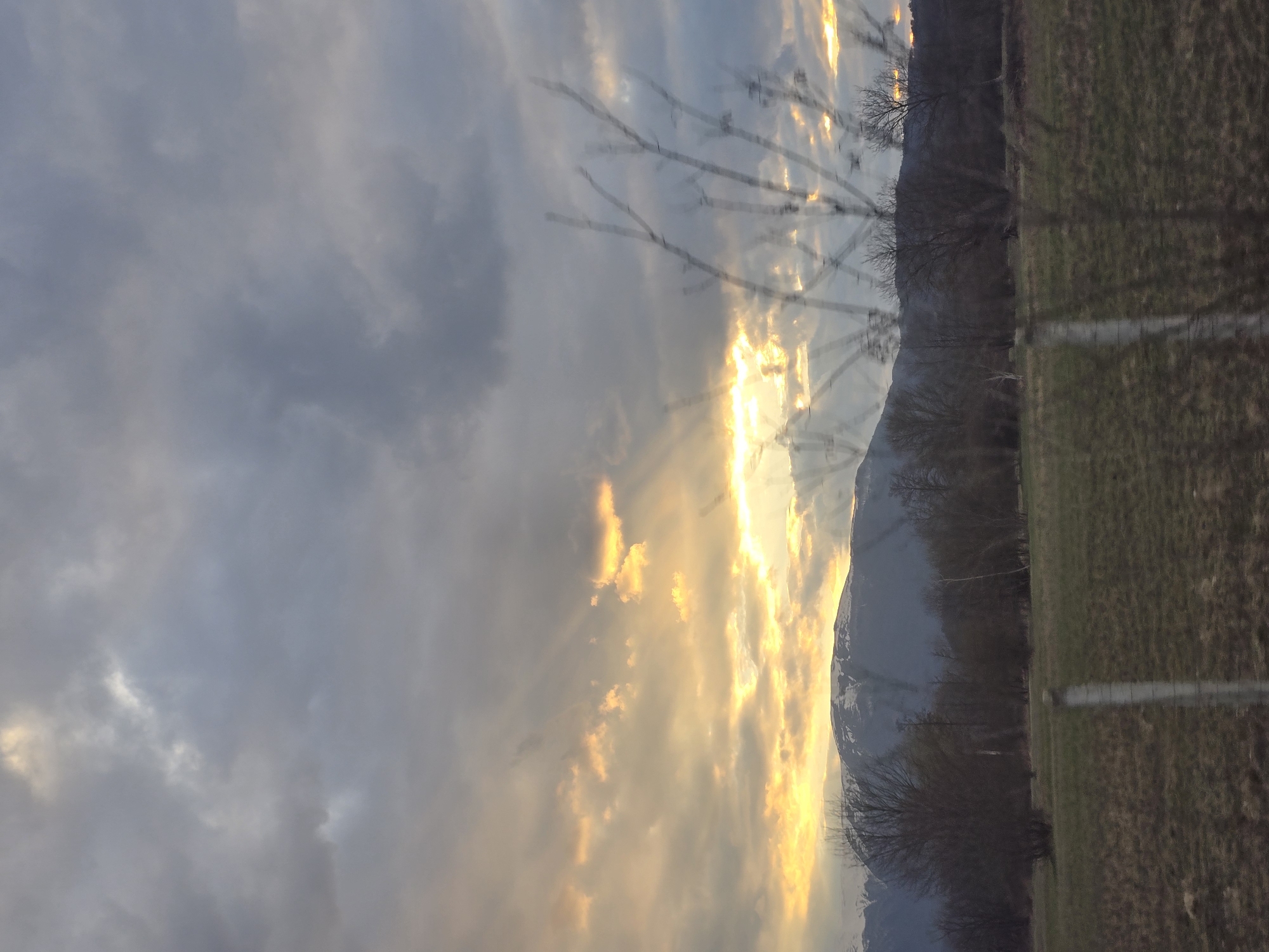 The image displays a landscape in Mezdreya, Bulgaria. The sky occupies the upper two-thirds of the frame, characterized by dense, dark gray and blue clouds. A prominent band of intense golden light, emanating from the horizon on the left and extending horizontally, is visible through a break in the clouds, with discernible sunrays projecting upwards. Below the sky, a dark mountain range with snow-capped peaks stretches across the background. In the middle ground, a line of leafless, dark-branched deciduous trees separates the mountains from the foreground. The foreground consists of a field of mixed green and brown grass. A blurred, light-colored vertical element, consistent with a fence post or wire, rises from the bottom-center of the frame, extending into the field. On the far right foreground, several blurred, bare tree branches partially obstruct the view. No people or discernible actions are present.