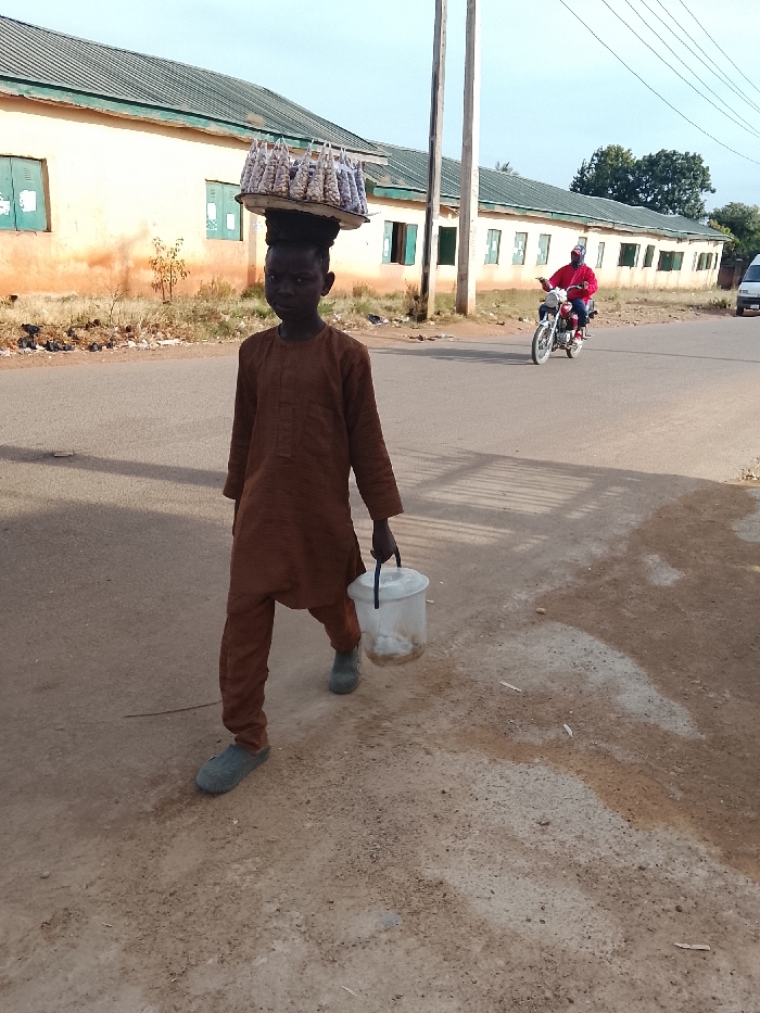 An image captured in the city of Unknown, Nigeria, depicts a street scene under natural light. In the foreground, a young dark-skinned male, approximately 8-12 years old, walks right-to-left on a packed dirt and gravel shoulder adjacent to an asphalt road. He wears a brown, long-sleeved tunic over matching trousers and grey slip-on shoes. Balanced on his head is a circular, flat tray laden with numerous small, transparent plastic bags containing a light-colored, granular substance, possibly groundnuts, arranged in a circular pattern. In his left hand, he carries a clear plastic bucket with a white lid and a dark handle, which contains a white, soft material. His gaze is directed towards the viewer. In the midground, on the asphalt road, a male individual wearing a red long-sleeved shirt and blue jeans rides a red motorcycle away from the viewer, positioned to the right of the walking child. Further down the road on the far right, a white van is partially visible. The background features a long, single-story building with a light cream-colored facade and a dark green corrugated metal roof. The building has multiple rectangular windows with light green shutters, some open, some closed. The ground between the road and the building is unpaved, consisting of dry dirt, sparse vegetation, and scattered debris. Two tall, dark utility poles stand vertically behind the child, intersecting the sky. Green trees are visible beyond the building to the right. The sky is bright and hazy, indicating daytime conditions. Shadows are cast on the ground from the subjects and utility poles, suggesting either morning or late afternoon.