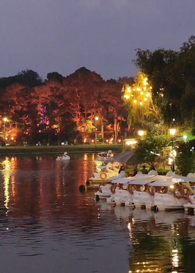The scene is an outdoor setting at dusk or twilight, likely a lake or pond with a park adjacent to it. The water is dark with reflections of the lights from the park, with a series of white swan-shaped paddle boats moored near the bank. Some of the boats appear to have people sitting in them. On the shoreline, there are trees illuminated by warm-colored lights and strings of lights hanging from trees. The overall mood is calm and peaceful, with the artificial lights providing a contrast to the dim natural light.