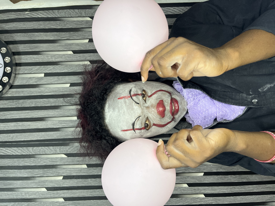 An individual is depicted in a waist-up, frontal portrait, costumed as Pennywise the Dancing Clown