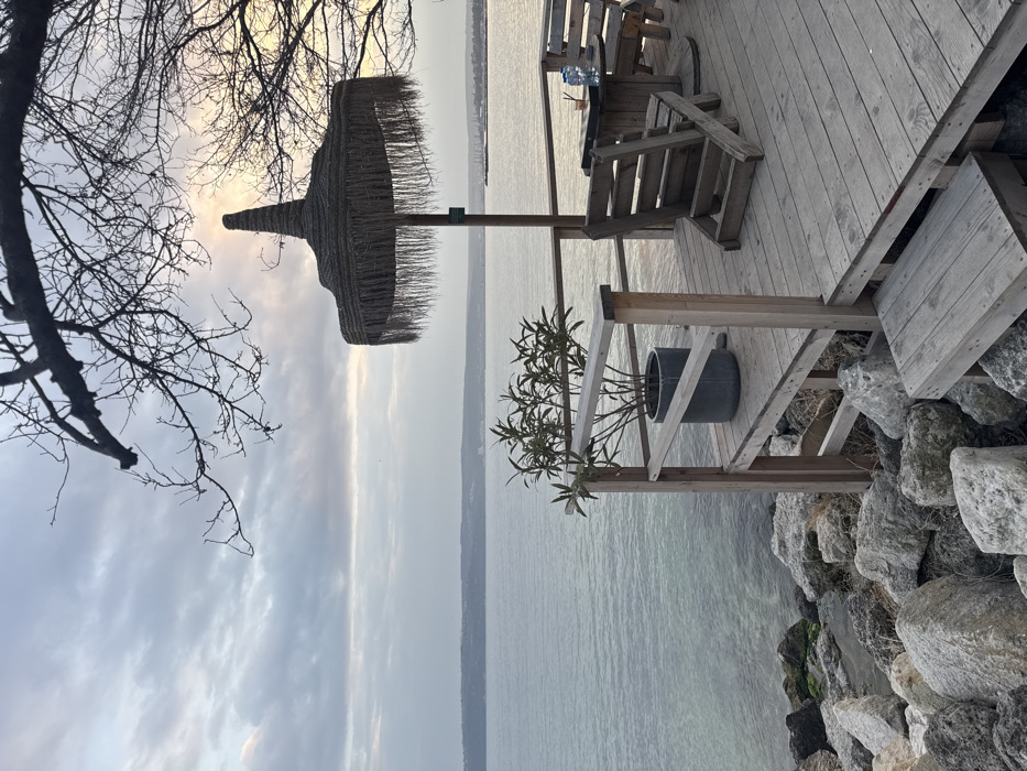 The image captures an outdoor dining or relaxation area on a rustic wooden deck overlooking the Black Sea coastline in Varna, Bulgaria. The deck, constructed from light-colored wooden planks, extends from the right and foreground, featuring a simple wooden railing along its edge. Immediately below the railing to the left, large, light-grey rocks form the shoreline, where the clear, calm water meets the land. On the deck, a large, conical parasol with a dark, thatched fringe stands on a wooden pole. Beneath it, a small, round wooden table is visible, holding two clear plastic bottles of water and a clear glass containing a straw. Two rustic wooden chairs or loungers are positioned around this table; one is angled away from the viewer, the other partially visible. A dark grey potted plant with green leaves is situated on a raised section of the deck near the railing. The background features a wide expanse of the Black Sea, which stretches to a distant landmass across the horizon, faintly showing structures consistent with a town or port. The sky is predominantly overcast with diffused light, indicating a time of day with low or obscured sunlight. Bare tree branches, devoid of leaves, extend into the upper portion of the frame, partially silhouetted against the sky. No individuals are present in the scene.