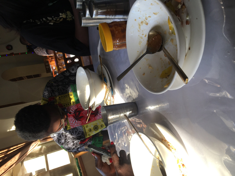 cluttered table with dirty dishes and utensils. There are plates, bowls, and spoons, covered in food remnants. Two people are visible: one wearing a colorful shirt and looking at a mobile phone, and another in the background wearing black and white. A jar with a yellow lid is also on the table. Light streams in through a nearby window, creating a bright glare across the table's surface.