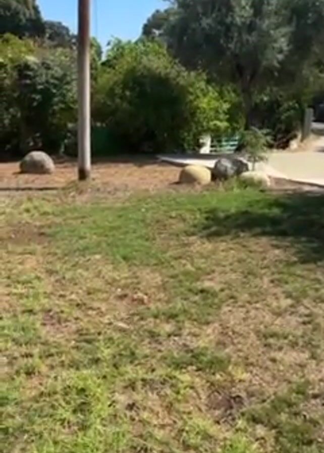 grassy area with patches of dead grass, a wooden pergola, a telephone pole, and various trees and bushes. There are some rocks scattered around the area. The sky is blue and sunny. In the beginning and the end of the video, a chicken sound can be heard.