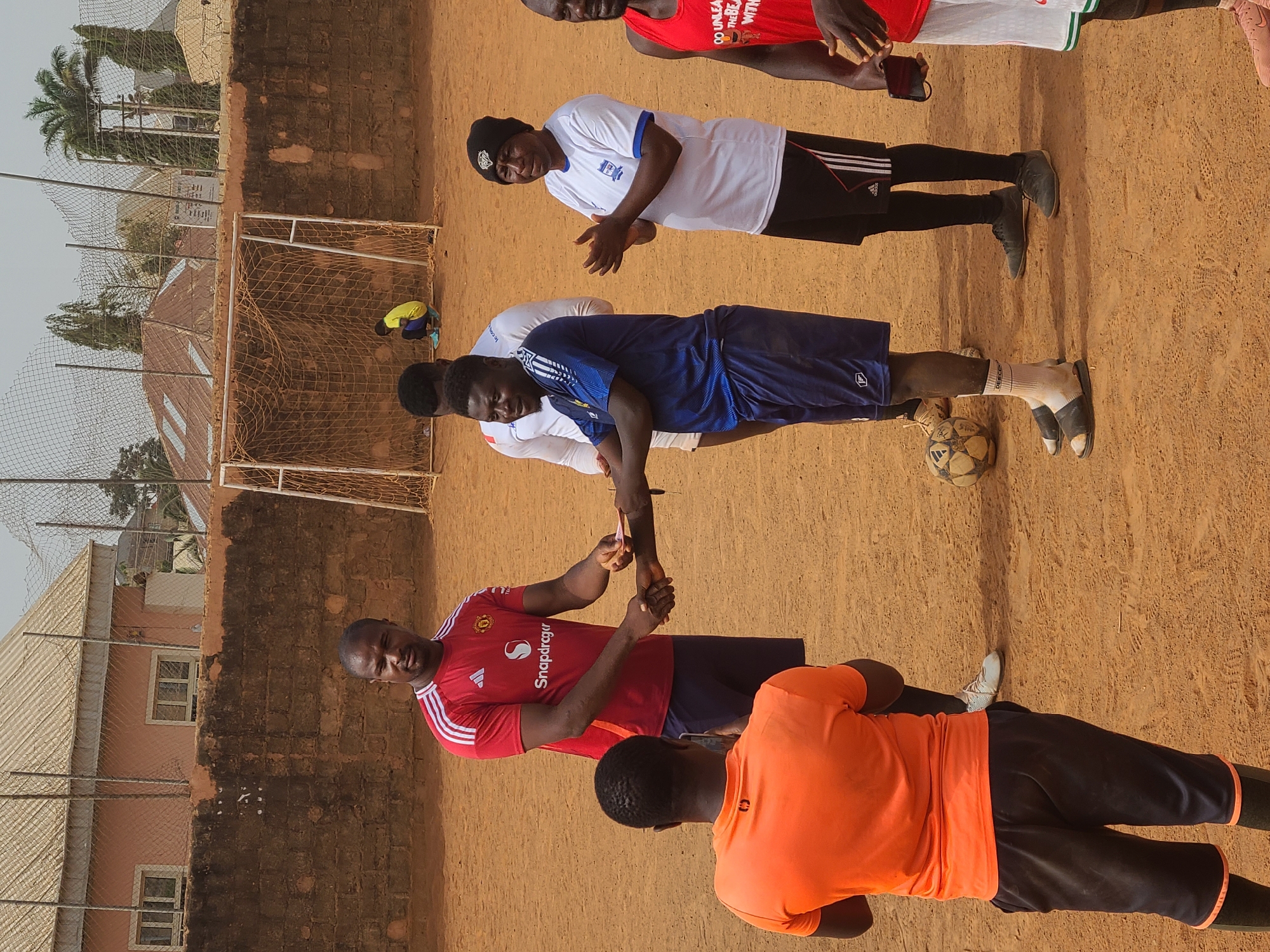 The image depicts an outdoor scene at an unpaved reddish-brown dirt football pitch in Barakin Lerawi, Nigeria