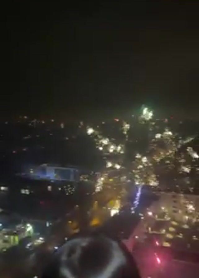 nighttime view of a city with fireworks exploding in the distance. The camera appears to be positioned from a high vantage point, possibly a balcony or high-rise building, overlooking the cityscape. Lights from buildings and streets are visible throughout the city. The fireworks are bright and colorful, with various bursts and patterns. The video pans slightly and ends inside a room with a cat.