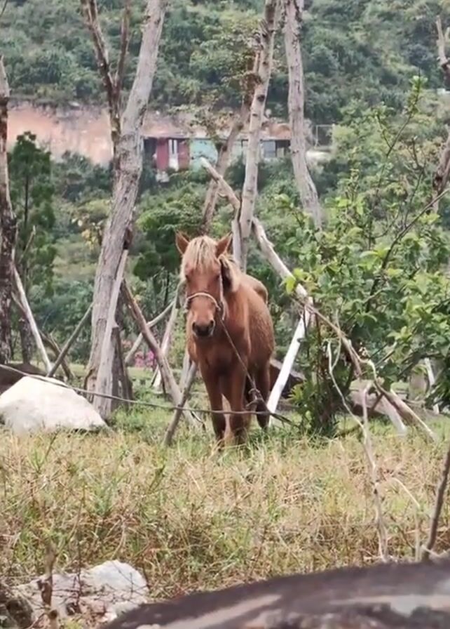 A medium shot depicts a light brown horse in a fenced grassy area. The horse is wearing a rope halter. Behind the horse is a background of trees and greenery, with a building visible on a hillside. The foreground consists of dry grass and a large rock.