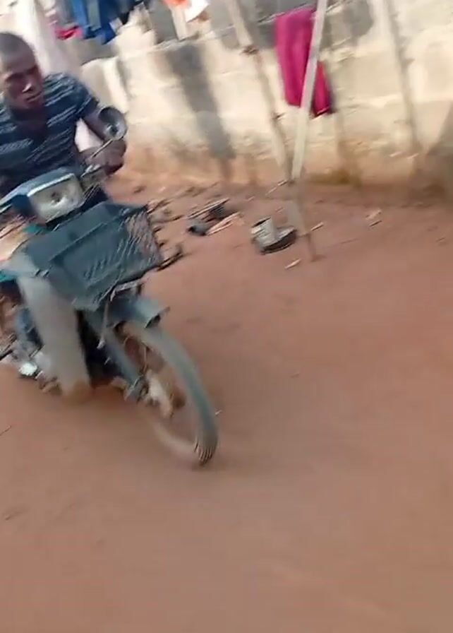 A person wearing a dark shirt and light-colored pants rides a small motorcycle down a dirt road. The motorcycle has a wire basket attached to the front. The environment is a rural area with buildings and objects scattered around. The ground is reddish-brown dirt.