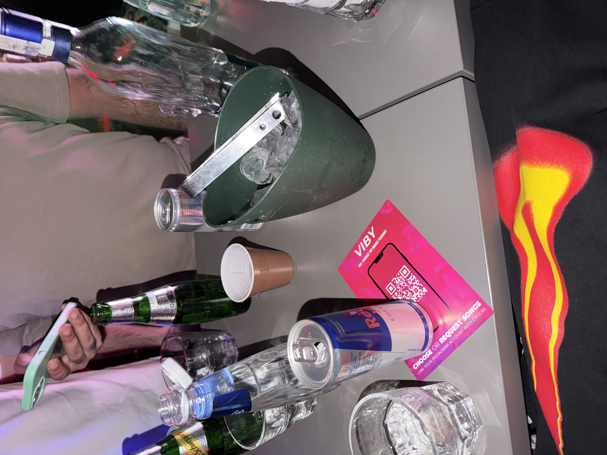 The image appears to be a cluttered bar or club setting. Multiple empty bottles, including champagne and vodka, are scattered across a reflective surface. An ice bucket filled with ice is visible, along with several glasses and a paper cup. A can of Red Bull energy drink sits near a pink promotional card for "VIBY," a service that allows users to choose and request songs. A person's hand is visible holding a phone, seemingly taking the picture. Part of a black shirt with a red and yellow flame-like design is in the upper right corner of the image. There is no concrete indication of the location being in Pleven, Bulgaria; this can't be confidently determined from the visual content.