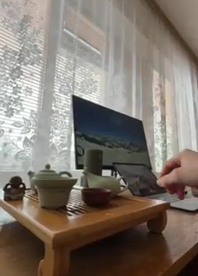 A close-up shot shows a wooden tea tray with a tea set on a wooden desk