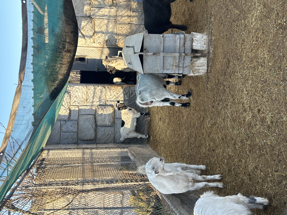 The image depicts an outdoor animal enclosure located within the city of Sarouja Municipality, Syria. The scene is illuminated by natural sunlight, casting distinct shadows. The enclosure floor is dry earth mixed with scattered straw or dried organic material. The left boundary consists of a chain-link fence with a concrete base, behind which bare tree branches or vines are visible. The right and rear boundaries are formed by a sturdy wall constructed from light gray, rough-hewn, rectangular imitation stone blocks. A dark, open doorway is set into this stone-block wall, leading to a darker interior space where at least two additional light-colored goats are partially visible. A dark green mesh shade cloth or netting is suspended overhead, partially covering the enclosure and draped over the top of the stone wall, attached by ropes or wires. A clear blue sky is visible above the netting. Seven goats are present in the enclosure. In the mid-ground, a white goat with black markings on its legs and hindquarters stands facing away from the viewer, its tail visible, and a reddish, possibly prolapsed, anus. To its left, another white goat with a shaggy coat stands, facing left with its head slightly turned towards the viewer. In the foreground, a third white goat with a shaggy coat is partially visible on the left, facing right. Near the stone wall, a white goat with distinct black patches on its head, neck, and back stands facing left. A metallic, multi-sided animal feeder with a crank-like handle on its top and two concrete or stone troughs at its base is positioned in the mid-ground, center-right. A dark-colored, possibly black, goat is partially visible on the far right, near the feeder. All visible goats are standing. No people are present.