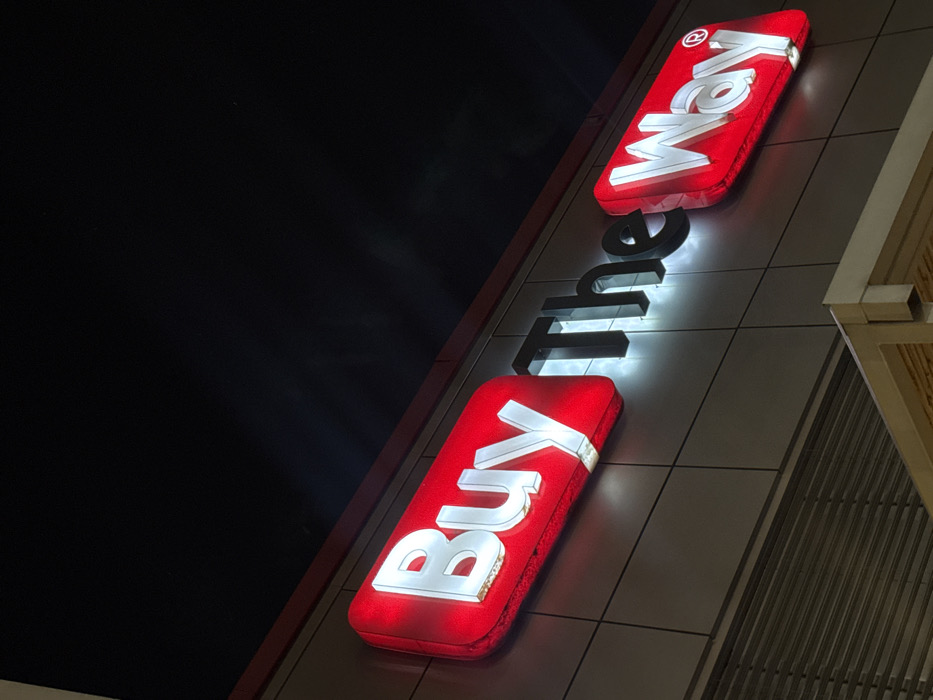 Illuminated red signs displaying "Buy" and "Way" flank the word "the" in large, dark letters