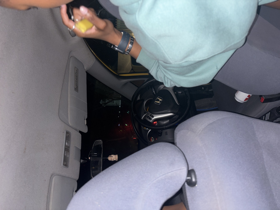 Inside a car at night, someone is cleaning the ceiling with a yellow sponge