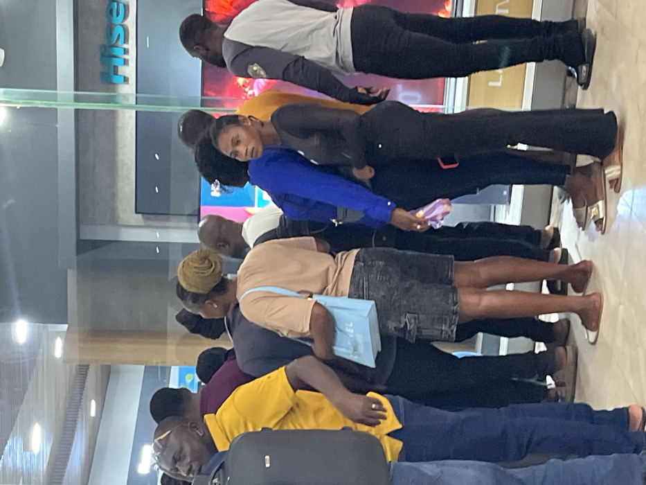 An indoor scene in a commercial establishment in Mile 11, Ghana, shows approximately ten individuals, primarily adults, standing in what appears to be a queue or gathering. The environment features modern architecture with bright overhead lighting, glass partitions, and a light-colored floor. In the background, a "Hisense" logo is visible on a display screen, indicating an electronics store or a retail section within a larger complex. From left to right, a male subject with short hair and sunglasses pushed onto his head wears a yellow short-sleeved shirt and blue jeans; a gold ring is visible on his left hand. Next, a female subject with light brown hair styled in a high bun wears a beige short-sleeved top, dark grey wash cargo shorts, and white and brown slip-on sandals. She carries a light blue shoulder bag with "CHANEL PARIS" printed on it. Behind her, several indistinct figures are visible. Further right, a female subject wears a royal blue long-sleeved top and dark pants, holding a crumpled purple-and-white patterned item. Immediately to her right, another female subject with dark hair wears a form-fitting black long-sleeved top, black flared pants, and gold flat sandals; she is looking towards the left foreground. At the far right, a male subject in a grey and dark-sleeved shirt and black pants stands. Most individuals face generally forward or slightly left, suggesting a common point of focus. No direct interactions between individuals are clearly discernible.