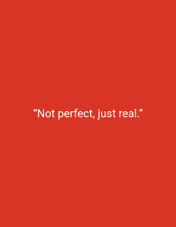 solid red background with the quote "Not perfect, just real