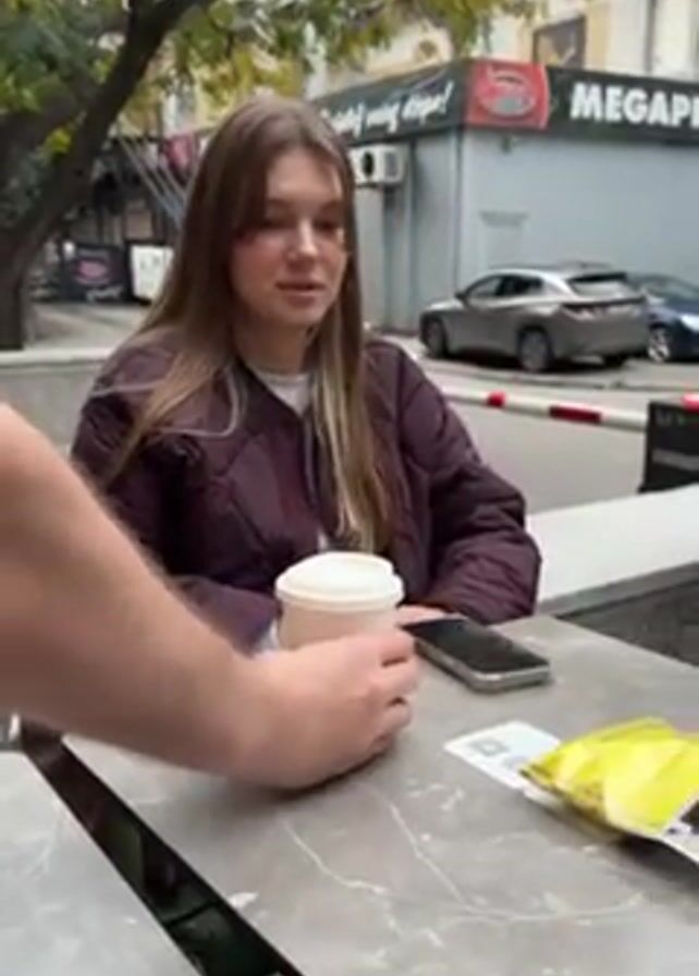 A young woman is sitting at an outdoor table next to a city street. A man places two white paper coffee cups onto the table in front of her. She is wearing a purple quilted jacket. Her phone and a bag of chips are also on the table. In the background are cars parked on the street and a building with a sign. There is a tree next to the table.