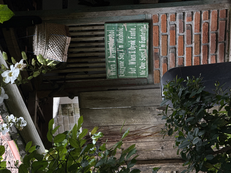 This outdoor scene in Tibubeneng, Indonesia, depicts a partial view of a rustic building entrance or patio area. Dense green foliage dominates the left foreground, with large leaves and trailing aerial roots. White flowers from a climbing vine are visible at the top, draped over an overhead wooden beam. A woven bamboo basket with a lid, suspended by dark cords, hangs from this beam to the right of the flowers. Directly below, a weathered wooden gate or wall section occupies the center. To the right of the wooden structure, a red-orange brick wall is visible, on which a rectangular, green painted wooden sign is affixed. The sign features white text arranged in four lines: "When I Drink Alcohol, Everyone Say I'm Alcoholic. But, When I Drink Fanta, No One Says I'm Fantastic." In the lower right foreground, partially obscured by plants, is a dark, curved object, likely a waste bin or large planter. In the background, beyond the central wooden structure, a glimpse of another building with light-colored, textured walls is visible. No individuals are present in the image.