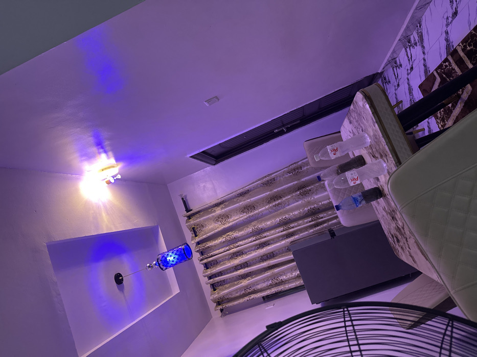 A low-angle shot reveals a room with purple-toned lighting. A light fixture emits a bright glow on the left, contrasting with a blue bottle-shaped lamp. Curtains adorn a window, with a gray cabinet partially visible in front. Three plastic water bottles rest on a marble-topped table. A white, quilted chair is on the right. The top of a black fan occupies the bottom center of the image.
