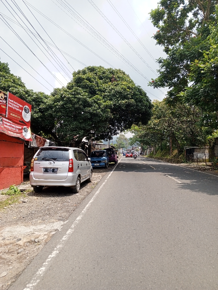 The scene depicts a roadside view in the city of Multhan, India, under an overcast sky. In the foreground, a silver minivan, identifiable as a Toyota Avanza with license plate F 1225 ZO, is parked on a gravel and dirt shoulder to the left of the asphalt road. Behind it, a blue vehicle and a partially obscured purple vehicle are also parked. A red building or wall is visible on the far left, partially covered by a red banner displaying white text and coffee cup graphics; the visible text includes phrases like "Kopil Hari dengan yang Spesial" and "Barang Kopi api." Numerous power lines crisscross the sky above the prominent green foliage of large trees that line both sides of the road. The asphalt road, marked with a continuous white line on its left edge, recedes into the distance, where several vehicles, including at least one red motorcycle with a rider, are observed moving away from the viewer. Dense trees and a low concrete wall border the right side of the road further down. No close-up individuals or direct interactions are evident. The environment is characterized by a mix of natural greenery and developed infrastructure.