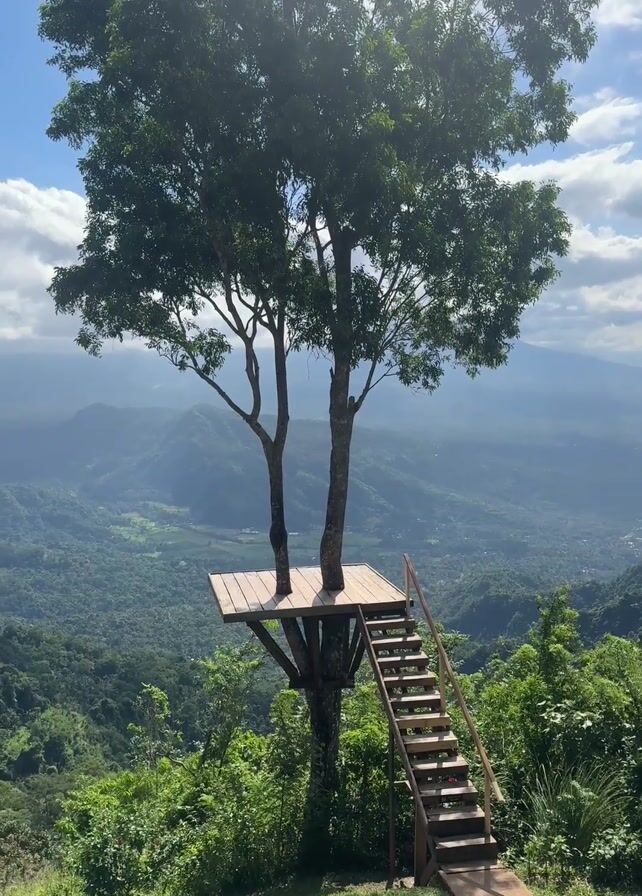 treetop observation deck. The deck is small and square, built around the trunk of a tall tree. A set of wooden stairs leads up to the deck from a path. The tree has green leaves, and there is lush green vegetation surrounding it. In the background, there is a wide view of rolling hills and valleys covered in green forests. The sky is blue with scattered white clouds. The camera pans slightly to the side to show a wider view of the valley.
