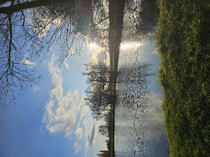 The image displays an outdoor landscape located in Gavisse, France. In the immediate foreground, a dense strip of vibrant green grass occupies the lower portion of the frame. Beyond the grass, a body of water, likely a pond or small lake, extends across the midground, reflecting the sky and sunlight with visible surface ripples. A line of deciduous trees, largely devoid of foliage, stands on the distant bank of the water. Further to the left on the horizon, additional trees are discernible. The sun is positioned low in the sky on the right side of the image, partially obscured by a cluster of trees and clouds, creating a bright glare and a prominent reflection path across the water's surface. The sky above is clear blue with dispersed white cumulus clouds. The upper right section of the frame is dominated by the silhouetted, bare branches of a large tree. No individuals or specific man-made objects are present in the scene.
