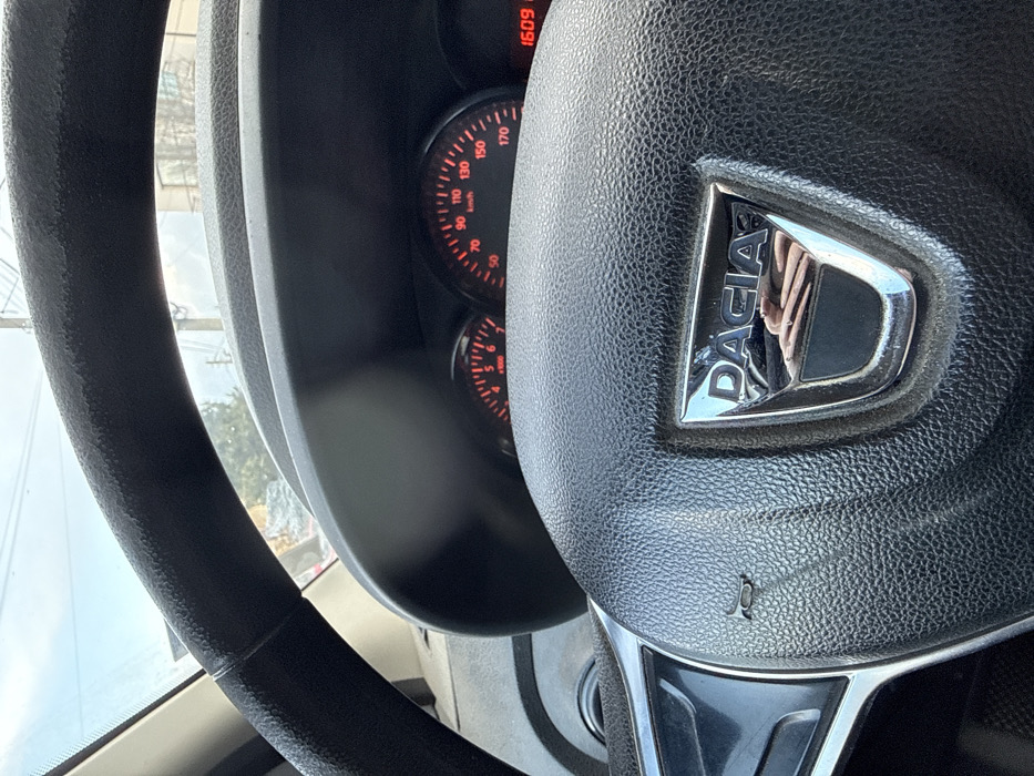 A first-person perspective image captured from inside a Dacia vehicle, looking forward over the steering wheel and dashboard on a clear day in Sofia, Bulgaria. The foreground is dominated by the black, textured steering wheel, featuring a central chrome Dacia logo. A reflection of hands holding a mobile device is visible within the Dacia emblem, indicating the photo's origin. The vehicle's dashboard is partially visible above the steering wheel, displaying instrument clusters with red backlighting, including a speedometer calibrated up to 170 km/h and a tachometer. A red digital display on the far right shows "1609." Dust is present on the dashboard and steering wheel surfaces. Through the windshield, a light blue sky, distant urban buildings, utility poles, and green foliage are discernible, indicating an urban or suburban environment.