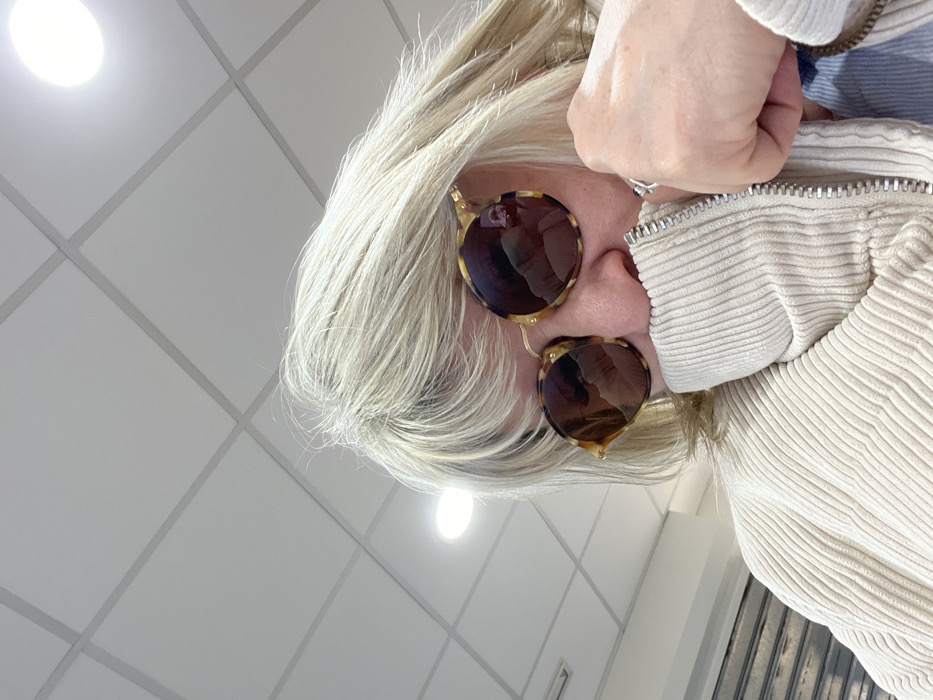 A person wearing sunglasses looks downward. The sunglasses have dark lenses and light brown frames. The person has short blonde hair. They are wearing a light-colored, ribbed jacket with a visible zipper. The background consists of a white, tiled ceiling with recessed lighting. The perspective is tilted, creating a sense of looking down at the subject.