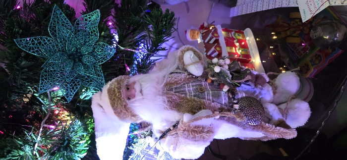 The scene is set indoors, in Ust-Ilimsk, Russia, featuring a festive, illuminated display. A prominent decorative figurine of Santa Claus, or Father Frost, stands in the foreground, facing forward. This figure wears a white fur-trimmed hat, a grey and white plaid tunic with brown fur accents, white mittens, and white boots. He has a long white beard and mustache. Over his left shoulder, he carries a white sack or bundle, from which a silver, textured spherical ornament hangs. In his right hand, he holds a small sprig of white berries and green foliage. Behind the main figure, on the left, a dark green artificial Christmas tree is visible, adorned with multicolored string lights (blue, green, purple) and a large, teal-colored, glitter-covered mesh poinsettia ornament. To the right of the main figure, a smaller, illuminated ceramic house ornament with red walls and a white roof is partially visible. A smaller Santa Claus figurine with a red hat sits atop this house. The figures and ornaments rest on a dark, reflective surface, likely a table. On this surface, to the right, are additional items: a stack of colorful, possibly wrapped, objects; a piece of white paper with handwritten Cyrillic text and numbers; and a spherical, reflective silver object. Small, warm-toned string lights are scattered on the reflective surface, contributing to the festive ambiance. The lighting throughout the image is dim, highlighting the illuminated decorations.