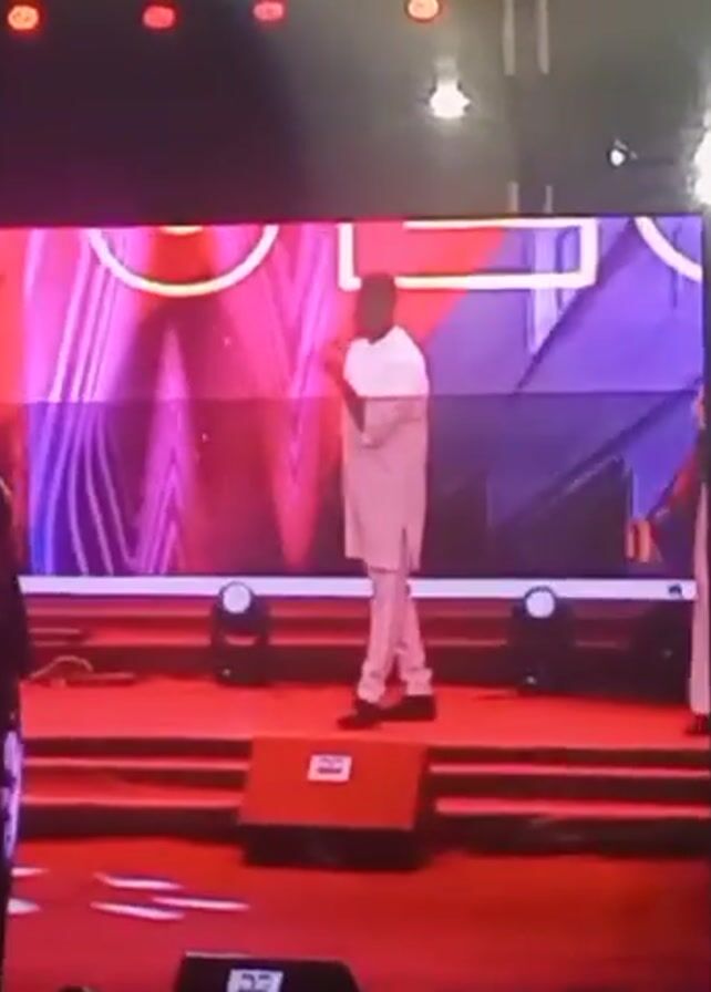 A low-angle shot captures a live performance on a stage with a red floor. A man stands center-right, wearing a white outfit with short sleeves and pants. He holds a microphone in his right hand. To his left, a woman in a long white dress and a headscarf also holds a microphone. To the left of her, a man with a guitar is wearing a white robe. A woman stands in the left foreground, dressed in a black outfit, singing into a microphone. Behind the performers, a large LED screen displays a dynamic pattern with pink and white stripes, circles, and geometric shapes. Red stage lights are arrayed across the top of the screen. The video is recorded from the perspective of someone in the audience, as the back of a head is visible in the bottom of the frame. The "TECNO CAMON" logo is present in the bottom left corner of the frame.