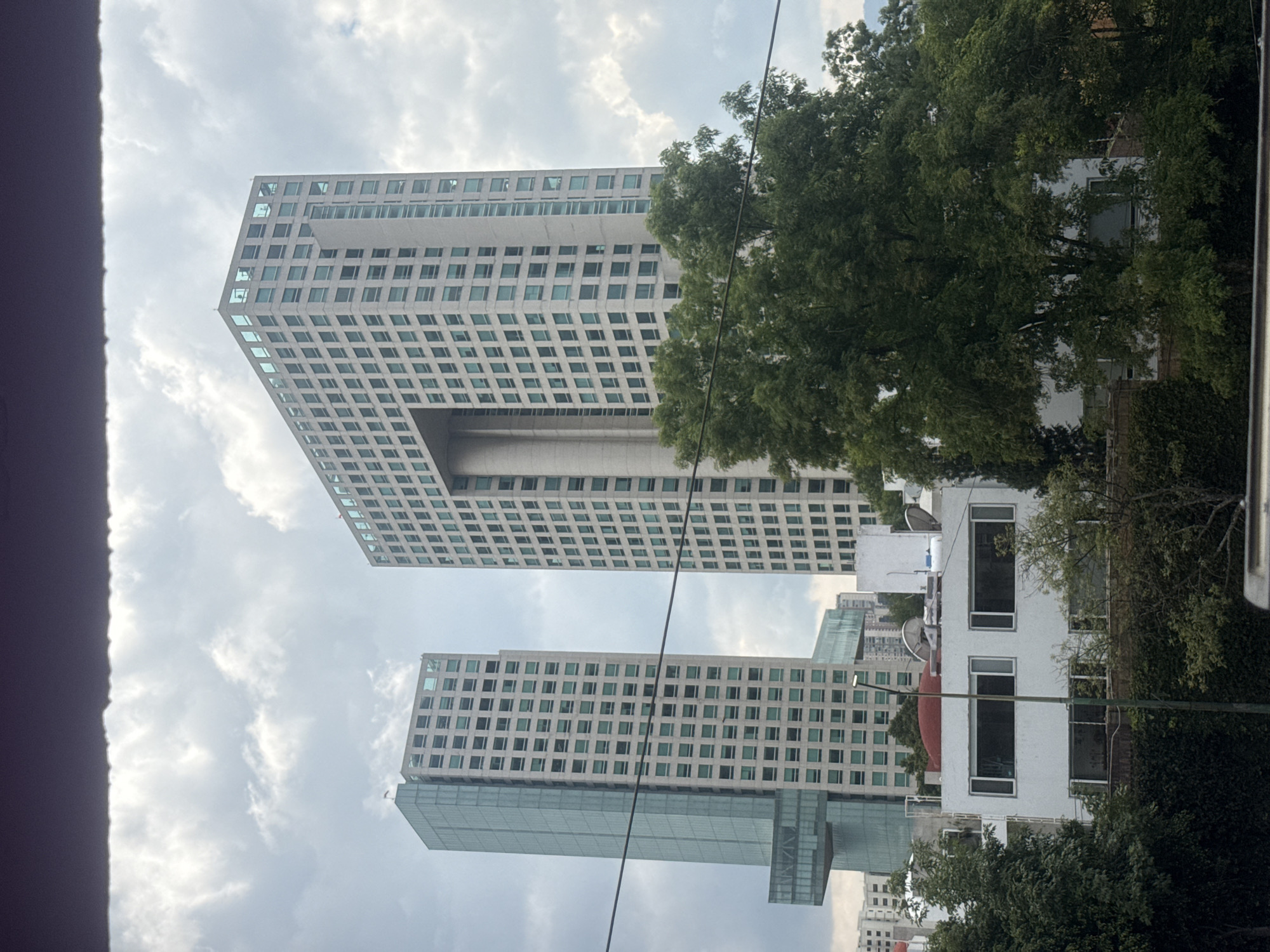 The image captures two modern, high-rise buildings with multiple windows in Mexico City, Mexico, seen through a cloudy sky. The architecture of the taller building features a noticeable gap or "hole" in its upper structure. Trees partially obscure the view of the buildings, and in the background, there are other buildings, one of which is a white structure with large windows. The angle of the photograph is upward, suggesting it was taken from a lower position, possibly from a moving vehicle. An obstruction is visible on the left side of the frame. The scene appears to be urban, with a mix of modern architecture and greenery.