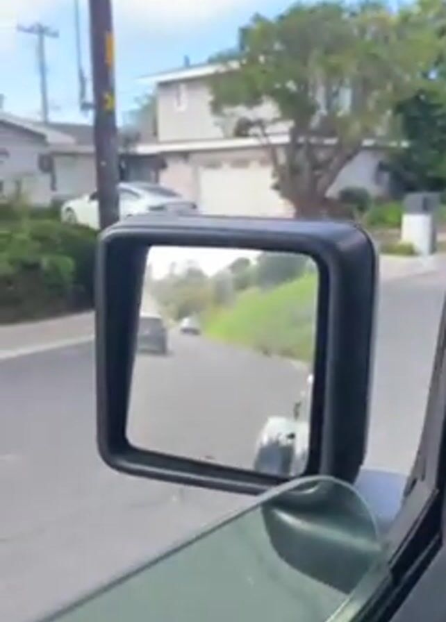 From inside a car, the viewer observes a white Tesla Model 3 parked in a driveway