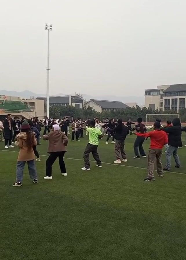 A group of people are on a green sports field, seemingly doing a workout or dance routine. They are spread out across the field, all facing forward with arms outstretched. Most of the people are dressed in casual clothing. The environment is an outdoor setting, with buildings and a light pole in the background under an overcast sky. A sports stadium is visible to the left side of the shot.