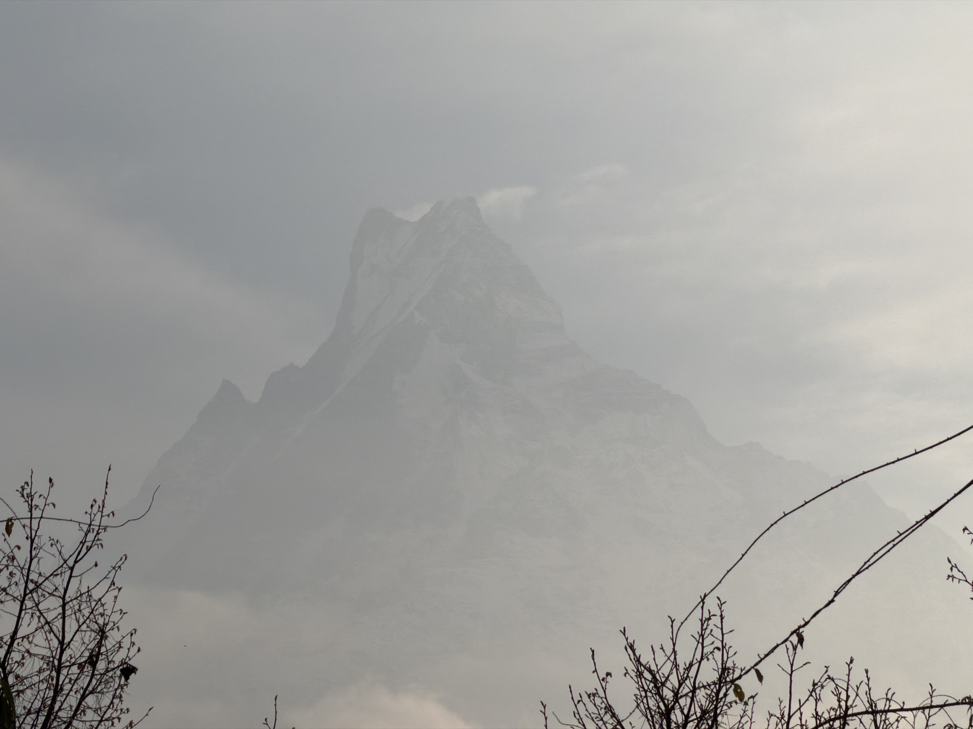 The image displays a majestic, snow-capped mountain, identified as Machapuchare (Fishtail Mountain), partially obscured by dense atmospheric haze and clouds, dominating the central and upper portions of the frame. This scene is viewed from the city of Purano Ghandruk, Nepal. The mountain's distinctive twin peaks are discernible through the atmospheric conditions. In the foreground, silhouetted against the diffused, light grey sky, are numerous dark, bare branches of deciduous trees or shrubs, some exhibiting small buds and a few sparse, withered leaves. A prominent, thin, dark linear element, possibly a wire or flexible branch, extends diagonally from the upper right towards the lower center. The overall illumination is soft and ambient, characteristic of an overcast sky or significant atmospheric diffusion. No individuals or explicit actions are depicted.
